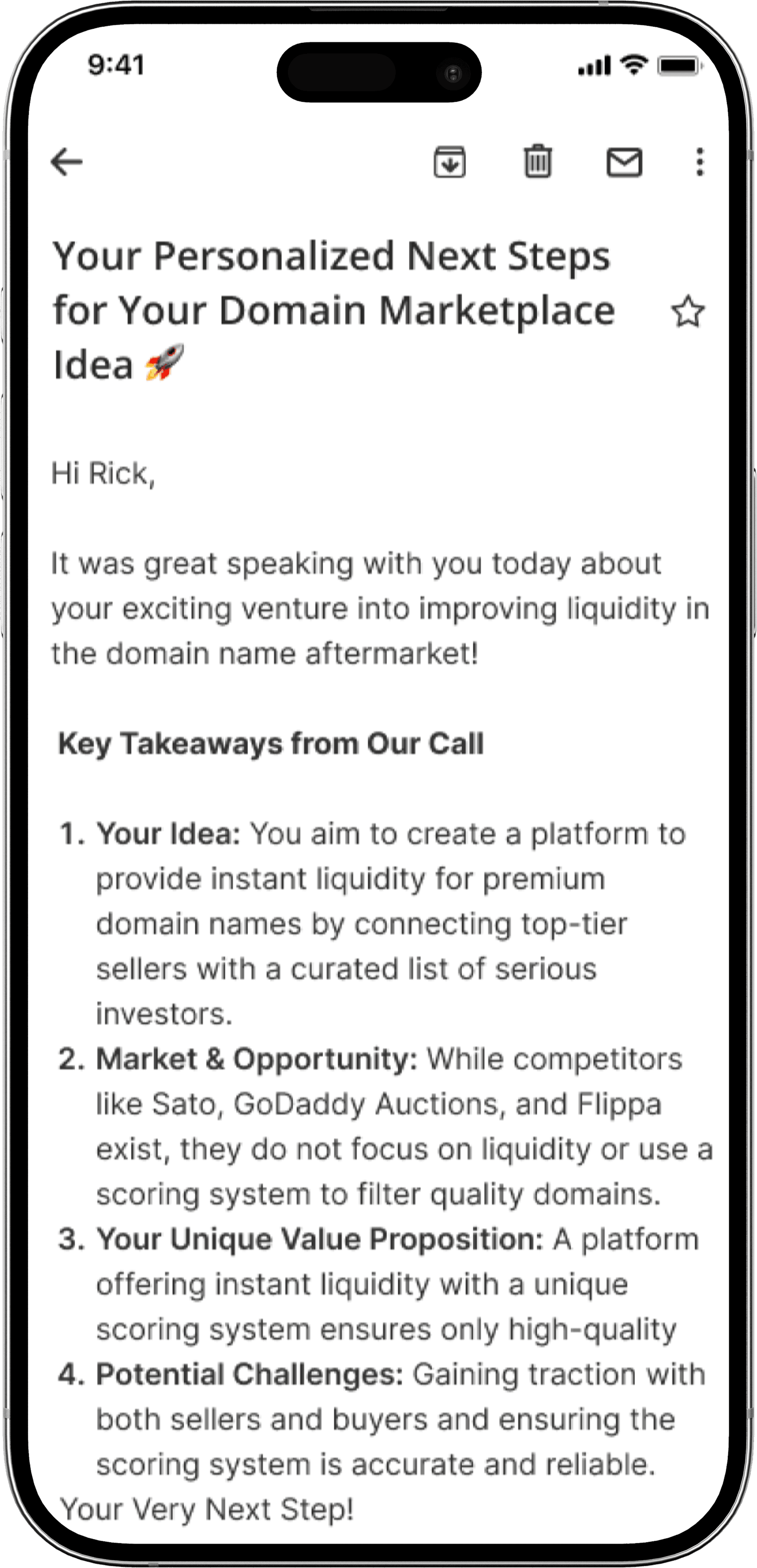 Val is the startup advisor we all wish we had at the beginning: fast, honest, and grounded in real market data. While you chat, Val researches your space in real time: identifying competitors, your customer profile, and how your idea fits into the market. Then she gives you a clear value proposition to consider, and useful assets like next steps, launch advice, and helpful tools… all personalized to your idea.